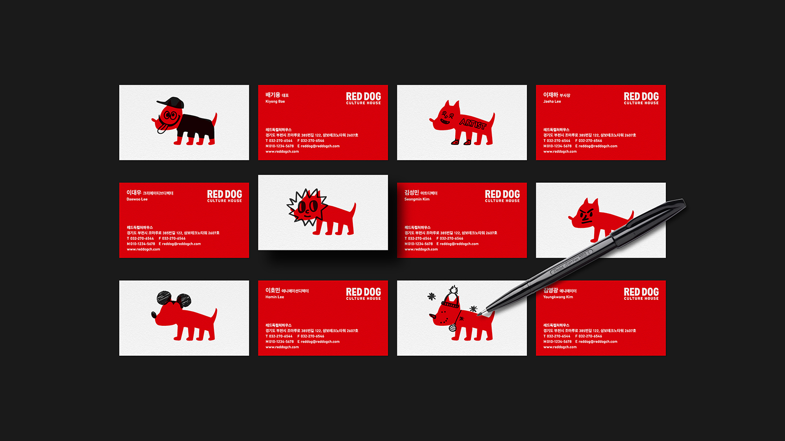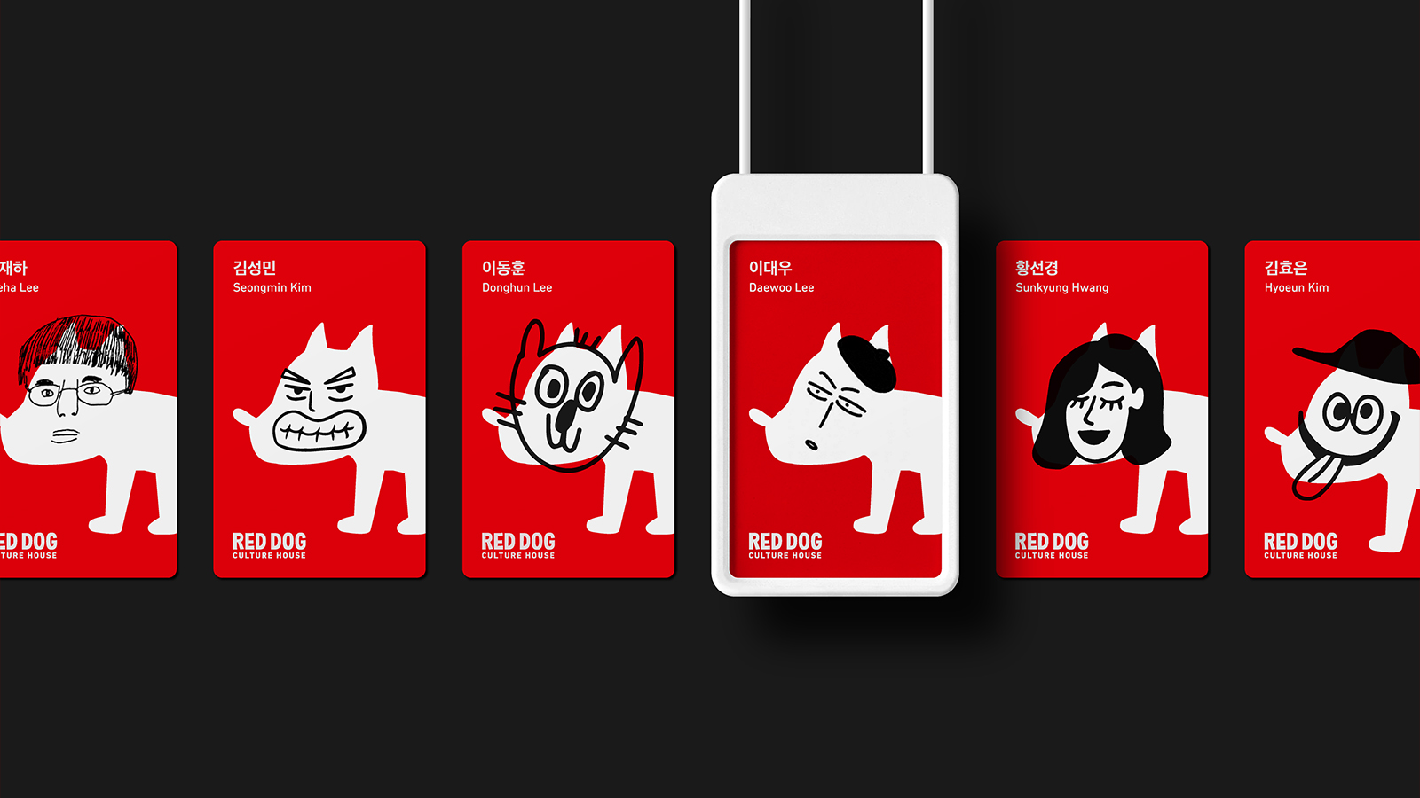 The words 'Red dog', 'Culture', 'House' were the keywords which we utilized to develop the brand concept and image. Red Dog is an effective symbol to represent the brand as an intuitive and strong motif. For Culture (subculture)' which represents the brand concept and core values, we played with an unconstrained expression of character, not a formulaic shape, to express the image of subculture. House represents the collection of stories that gather all these remarkable artists together, and is the place where each artist can bring their own ideas and drawings to life.